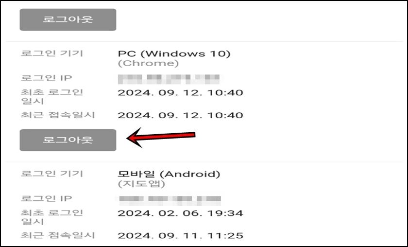 리스트를 보시면 여러분들이 로그인했던 기기와 IP, 로그인시간 정보 등을 확인할 수 있어요. 어떤 기기인지 모르겠으면 상단의 "전체 로그아웃"을 클릭하셔도 되고 기기와 시간등을 확인하셔서 필요한 부분은 "로그아웃"을 클릭하여 해당 기기에서 로그아웃을 진행할 수 있어요.
