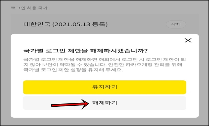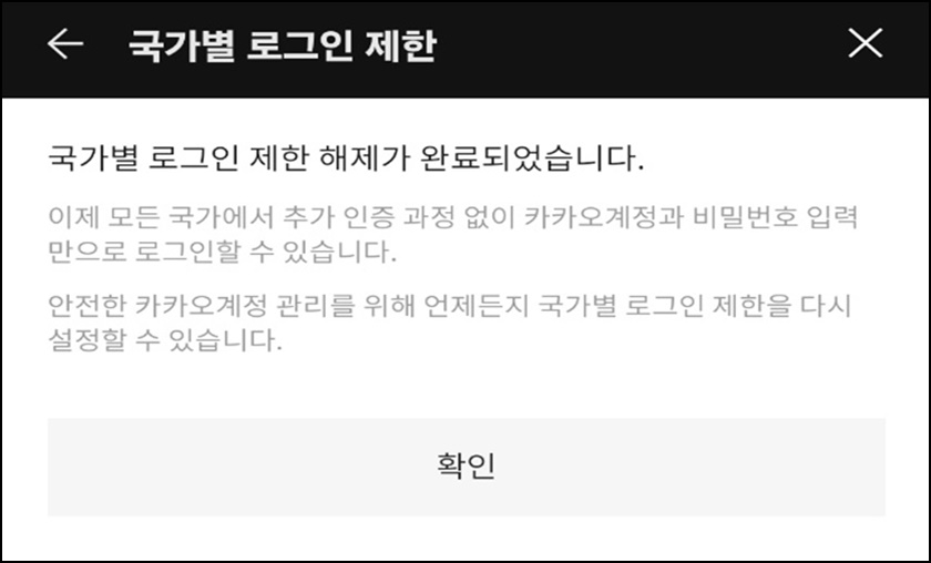 위 사진을 보시면 "국가별 로그인 제한 해제가 완료되었습니다"라는 메시지를 확인할 수 있습니다. 이제 여러분들이 해외여행을 가셔도 카카오 계정에 로그인은 차단되지 않습니다. 아주 간단하죠?