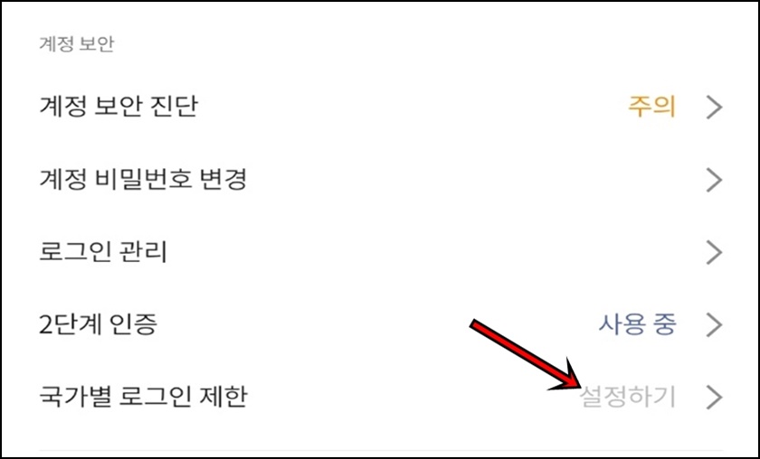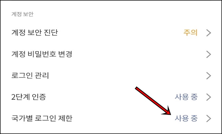 페이지 중간쯤에 [계정보안] 메뉴를 보시면 "국가별 로그인 제한"이 사용 중으로 되어 있을 텐데 해당 메뉴를 클릭해 주세요.