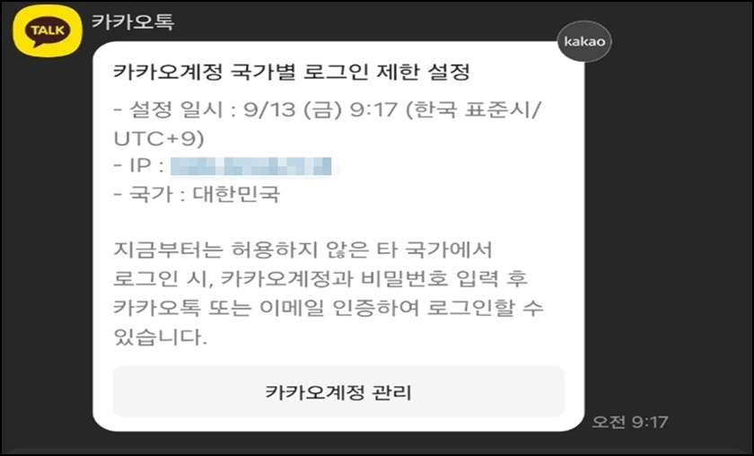 여러분들의 카카오톡으로 "카카오계정 국가별 로그인 제한 설정"이 되었다는 안내메시지를 확인할 수 있습니다.