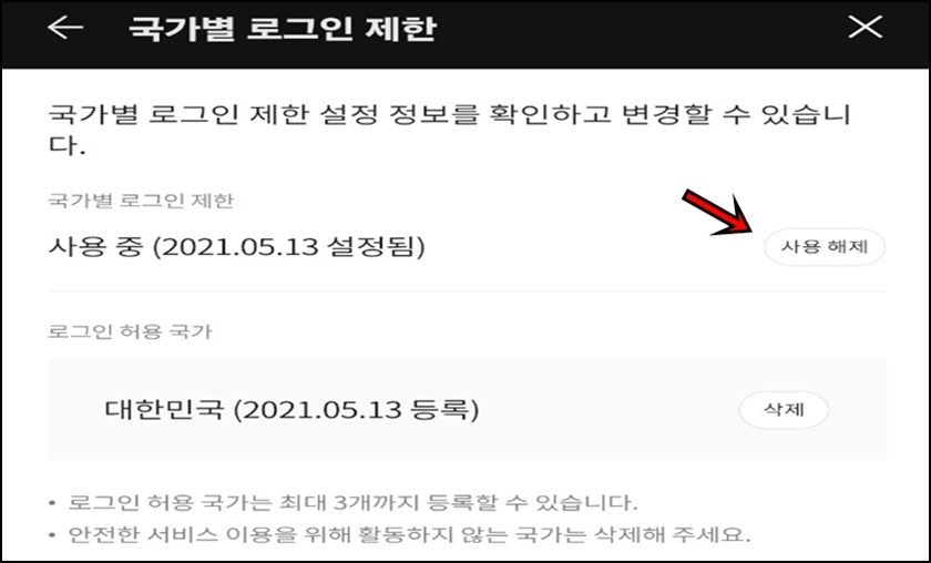 로그인 허용국가는 [대한민국]으로만 설정되어 있어요. "국가별 로그인 제한"메뉴의 "사용 해제"를 클릭해 주세요.