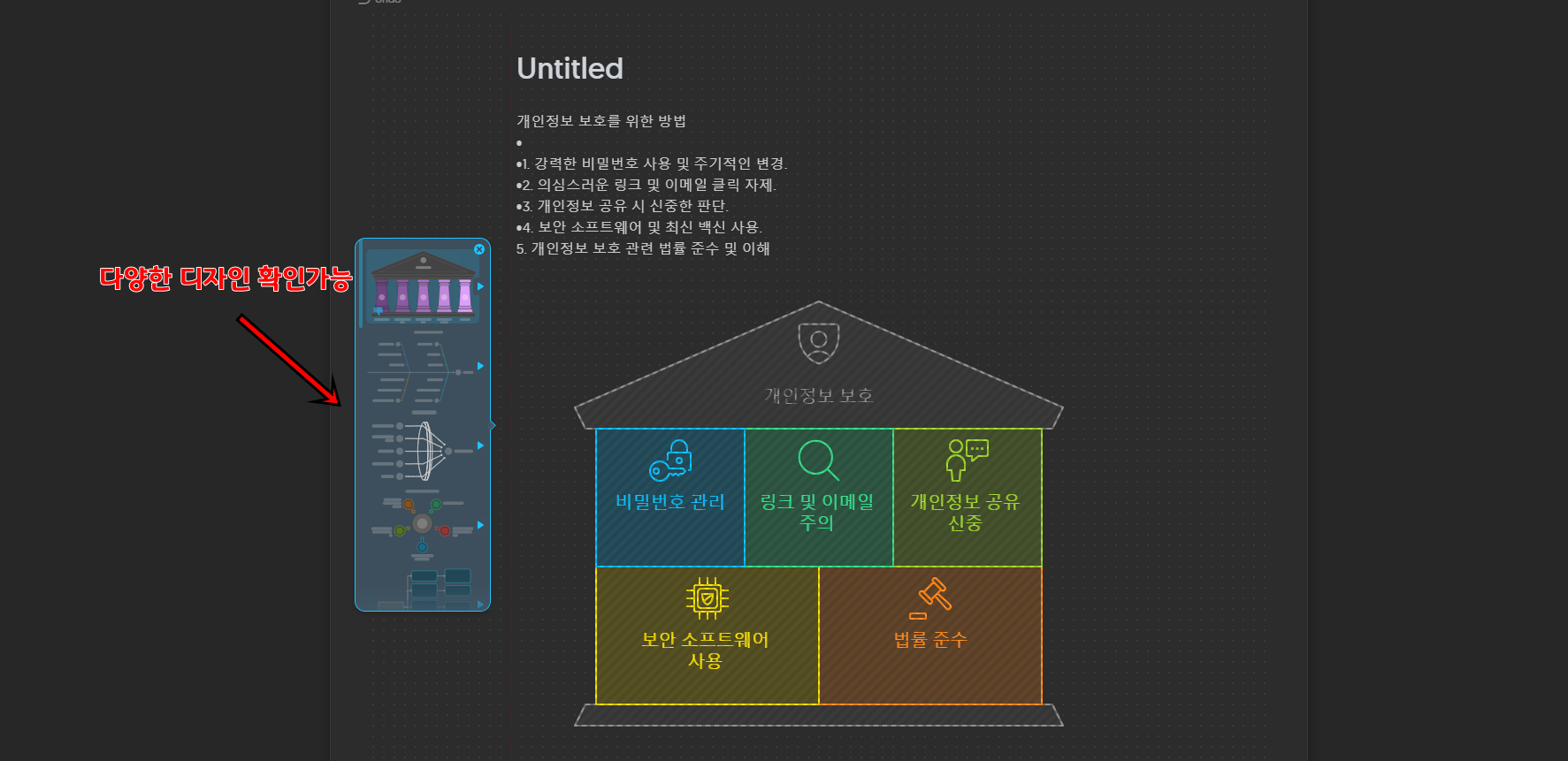 만약 "개인정보 보호를 위한 방법"에 대해 PPT자료를 만들라고 하는 상사의 요청있다고 가정해 볼게요. 위 사진처럼 텍스트만 있는 PPT자료를 제출했다가는 엄청난 후폭풍이 예상되지 않으신가요? 위와 같은 텍스트정보를 가지고 이미지나 차트등 깔끔하고 예쁜 구성을 하고 싶을 때 여러분들은 머리를 엄청나게 써야 하실 거예요. 하지만!!! 이 텍스트만을 가지고 AI가 디자인을 해준다면 믿으시겠습니까? 그 방법을 설명드릴게요.
