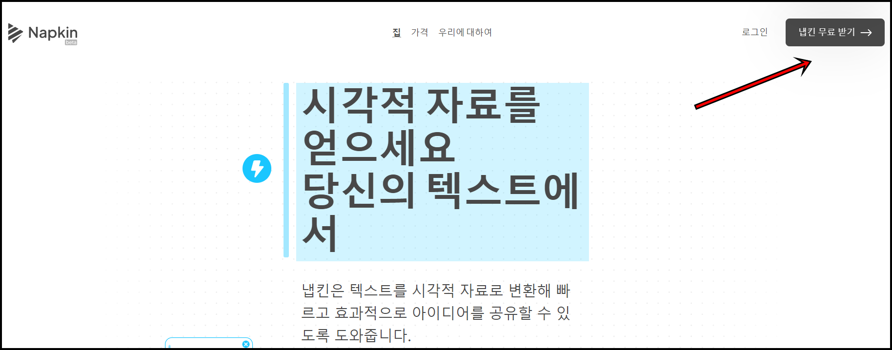 한글로 번역이 되었는데 오른쪽 상단의 [Get Napkin Free, 냅킨 무료받기]를 클릭해 주세요. 간단한 로그인이 필요한데 구글 계정만 있으시면 쉽게 로그인되실 거예요.