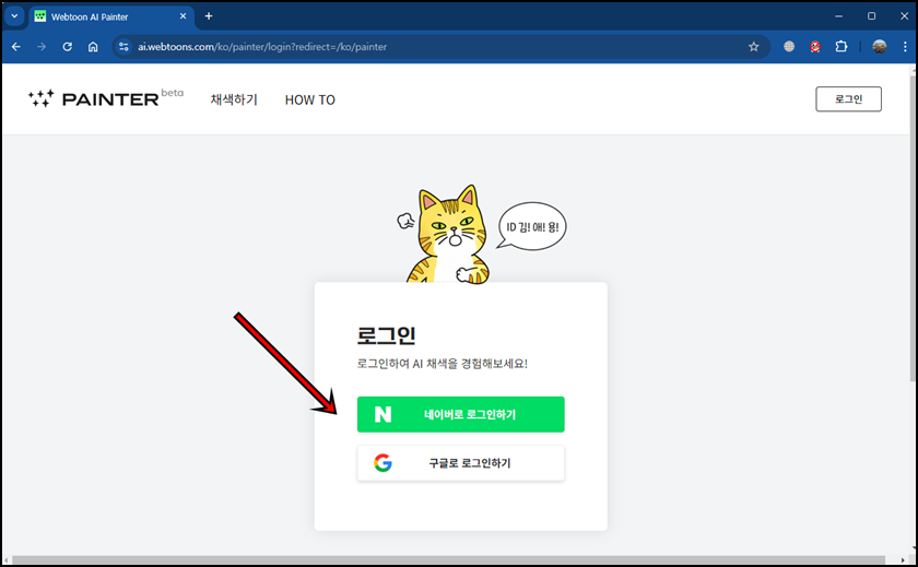 먼저 네이버 검색창에 "AI채색"을 검색하셔서 웹툰 AI 페인터에 들어가시거나 위 첨부드린 링크를 클릭하여 사이트 접속을 해주세요. 간단한 로그인 절차가 필요한데, 대부분 네이버계정은 가지고 계실거라 믿고 "네이버 로그인하기"를 클릭해