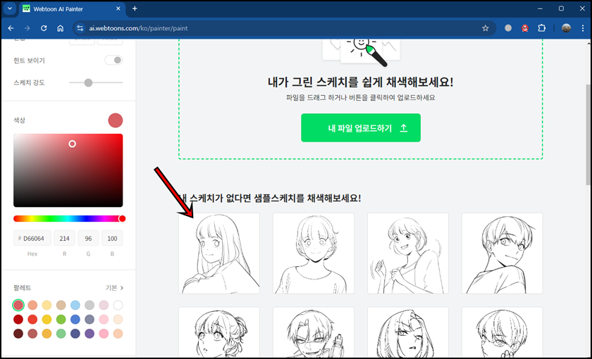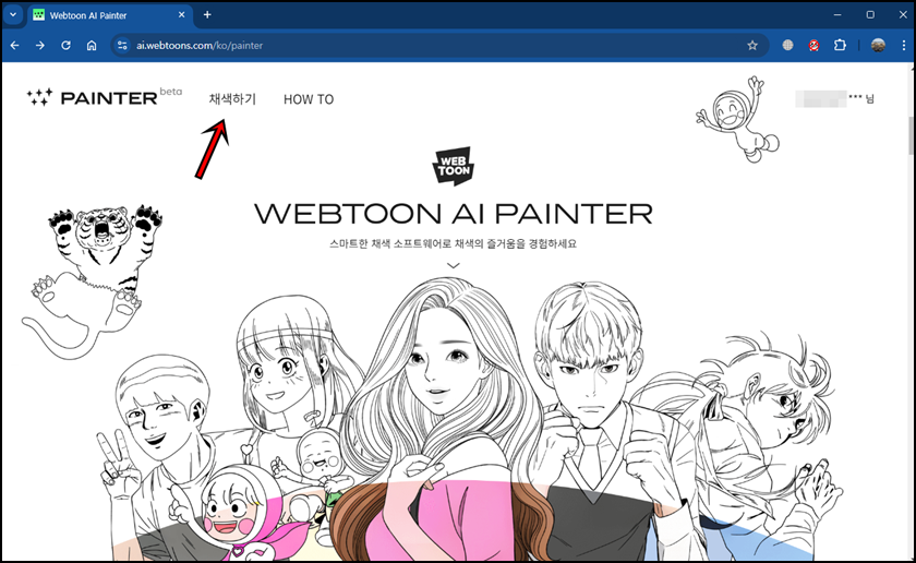 자 이제 로그인이 되었어요. 왼쪽 상단의 "채색하기"를 클릭해 주세요.