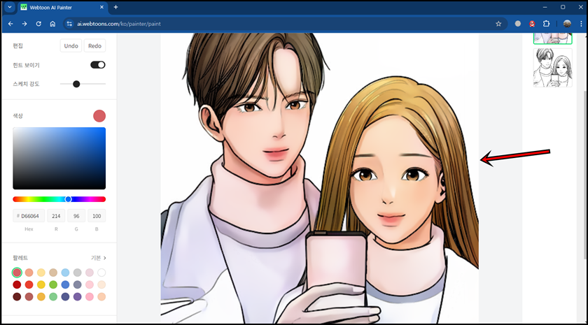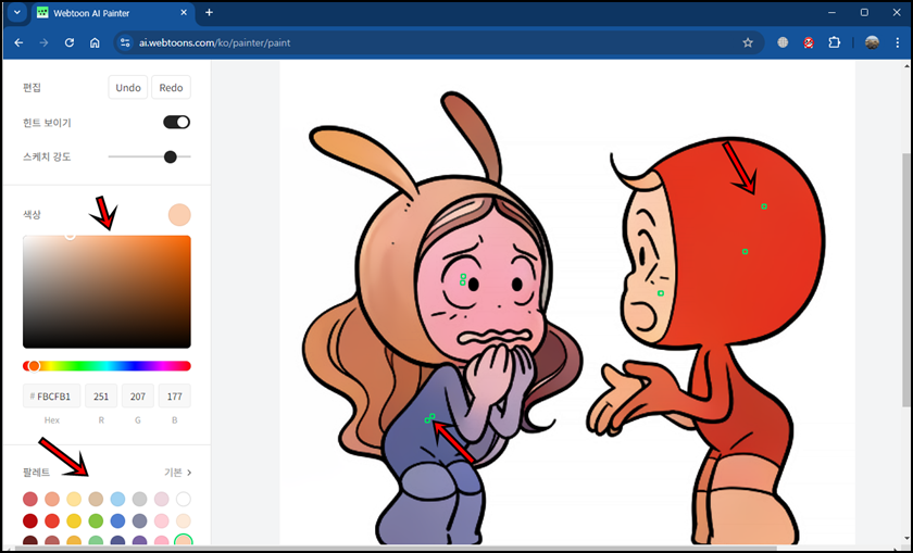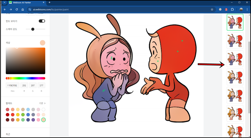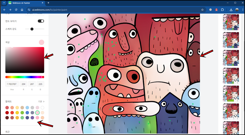 왼쪽 팔레트에서 여러분이 원하는 색상을 선택하고 색상 농도를 조정하여 그림에다가 클릭만 해주시면 위 사진처럼 색상이 AI가 자동으로 적용해 줘요.