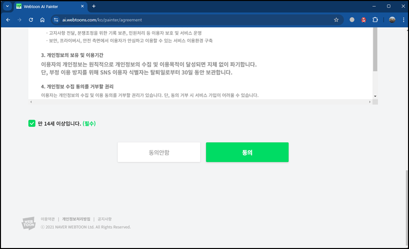 항상 그렇듯 개인정보 이용약관에 체크 하시고 "동의"를 클릭해 주세요.