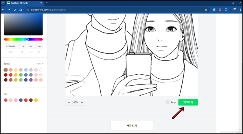 반대로 AI가 그림 전체를 자동으로 "채색하기" 기능도 있는데, "채색하기"버튼을 클릭해 보세요.