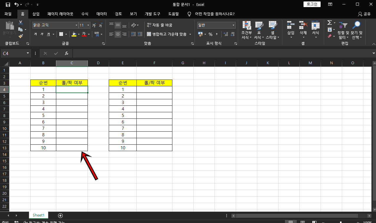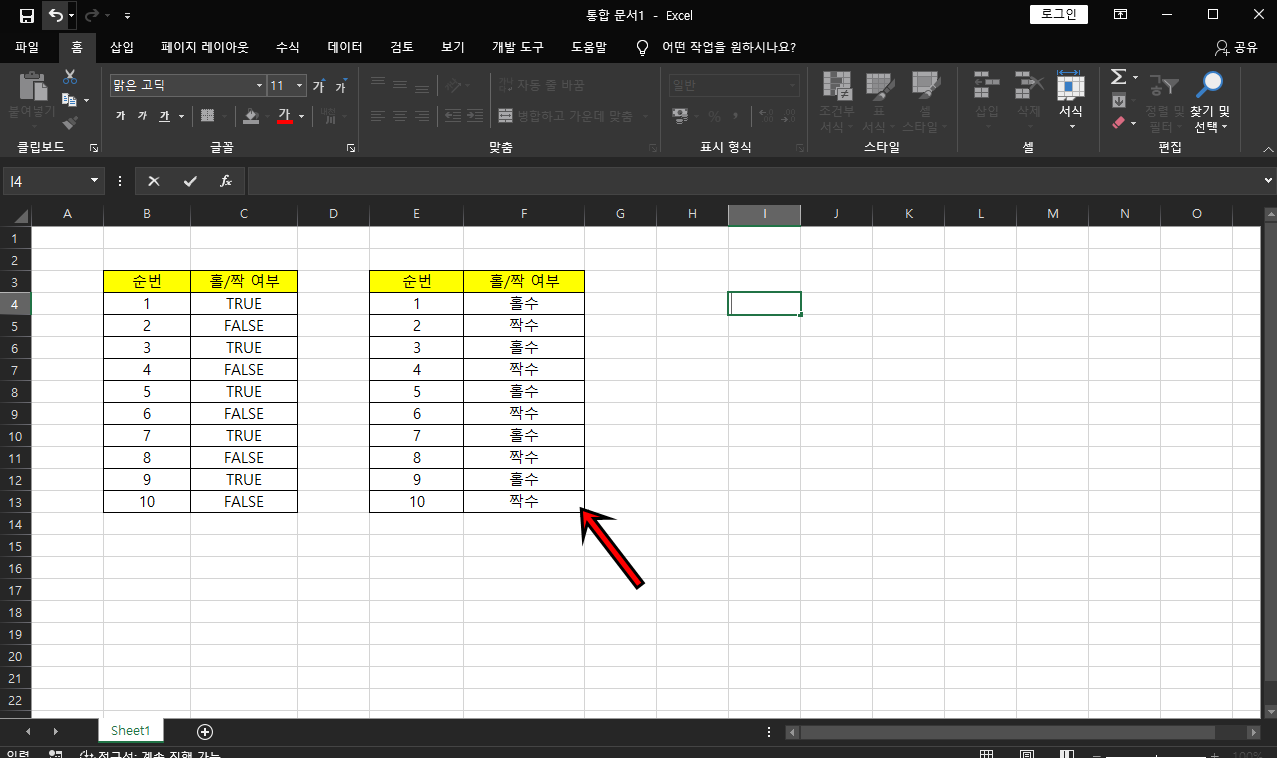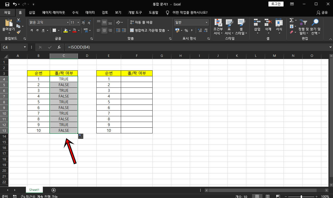 채우기 핸들을 통해 홀이면 TRUE, 짝이면 FALSE로 나왔는데, 이렇게 보셔도 되지만 깔끔하게 홀/짝으로 포현해보도록 할게요.