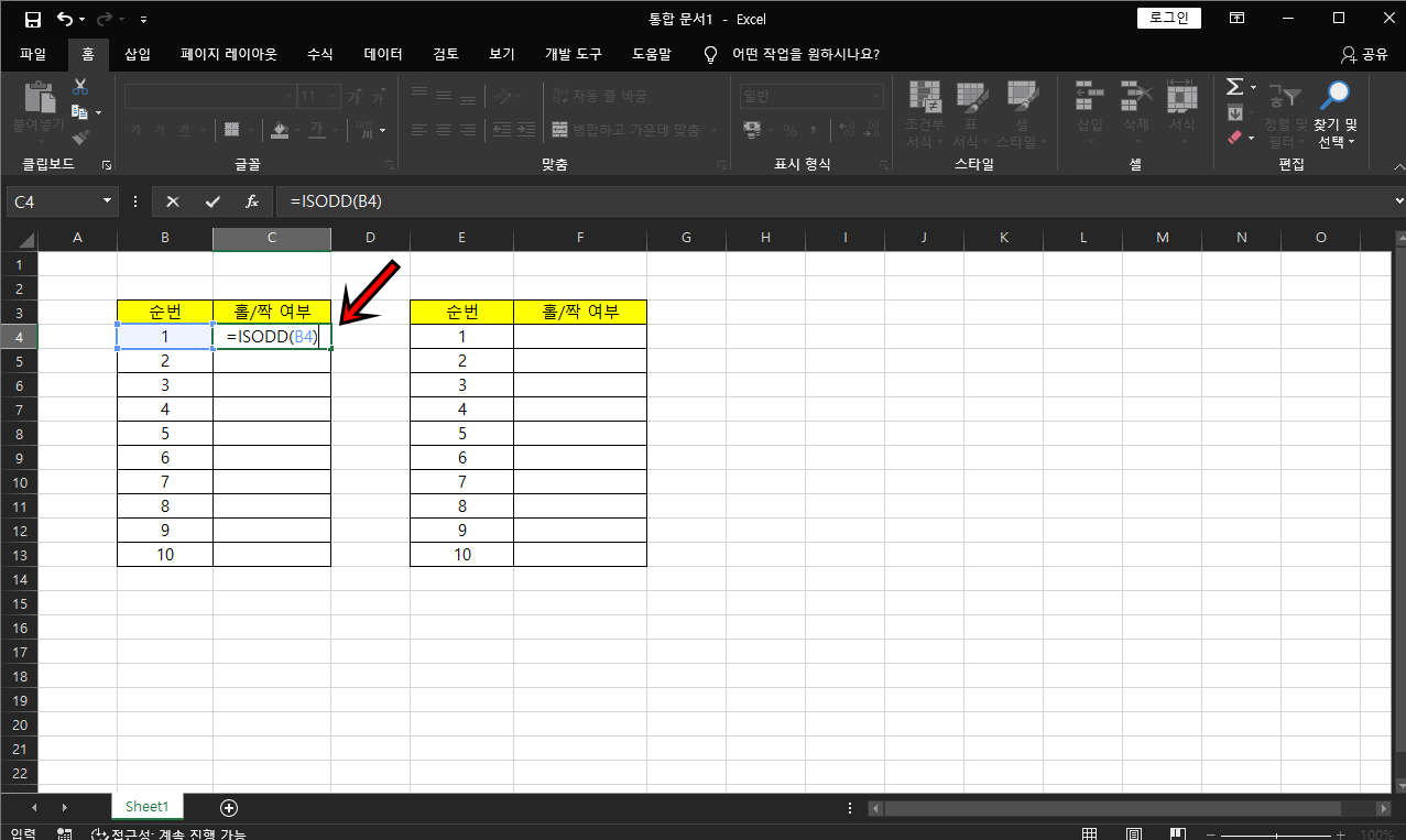 =ISODD(인수) = > =ISODD(B4)가 홀수 이면 TRUE을 반환할 거예요.