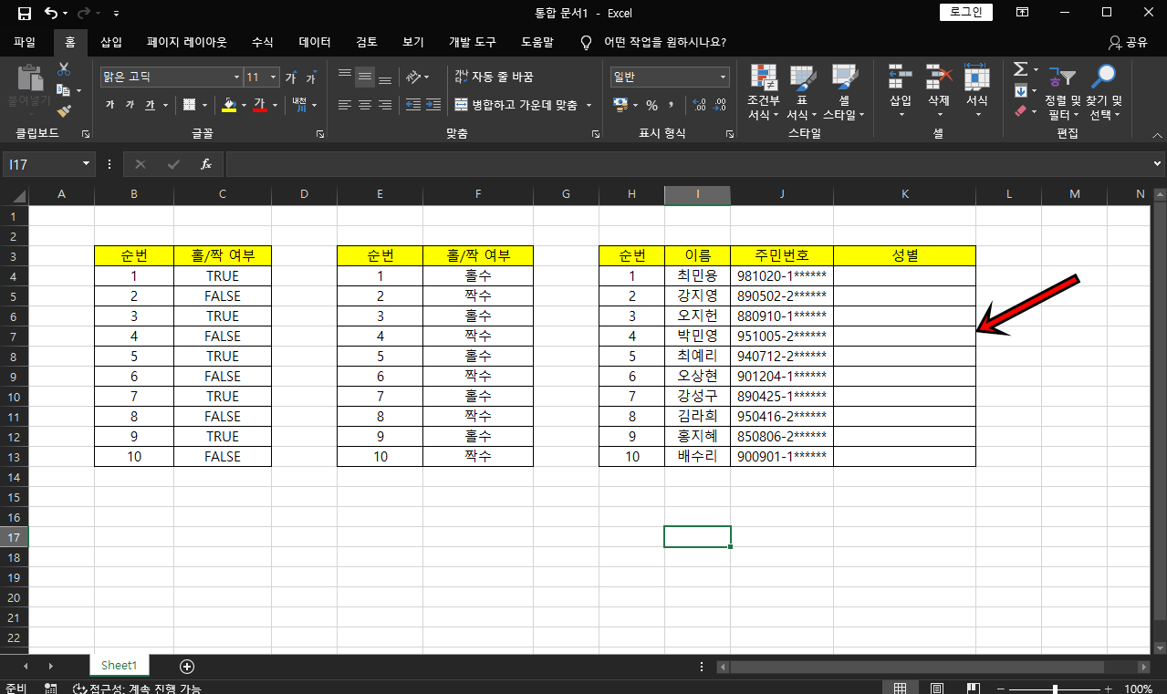 짜잔!! 이렇게 주민번호 뒷자리를 가지고 남/녀를 구별하는 데이터를 추출하게 되었어요. 참 쉽죠?