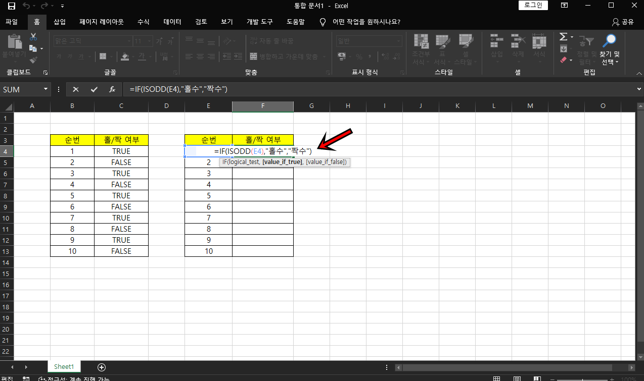 =IF(ISODD(E4), "홀수", "짝수") => 만약 인수의 값이 TURE이면 홀수, FALSE이면 짝수로 표현이에요.