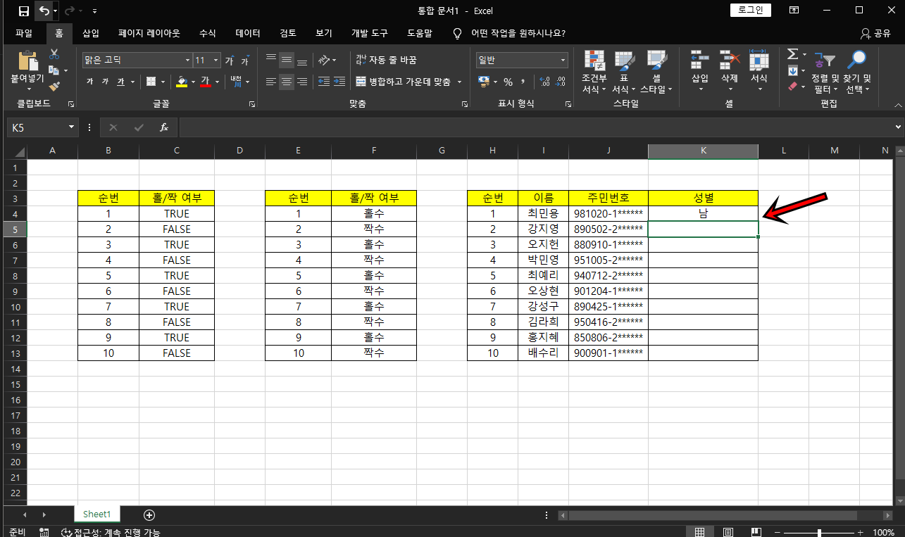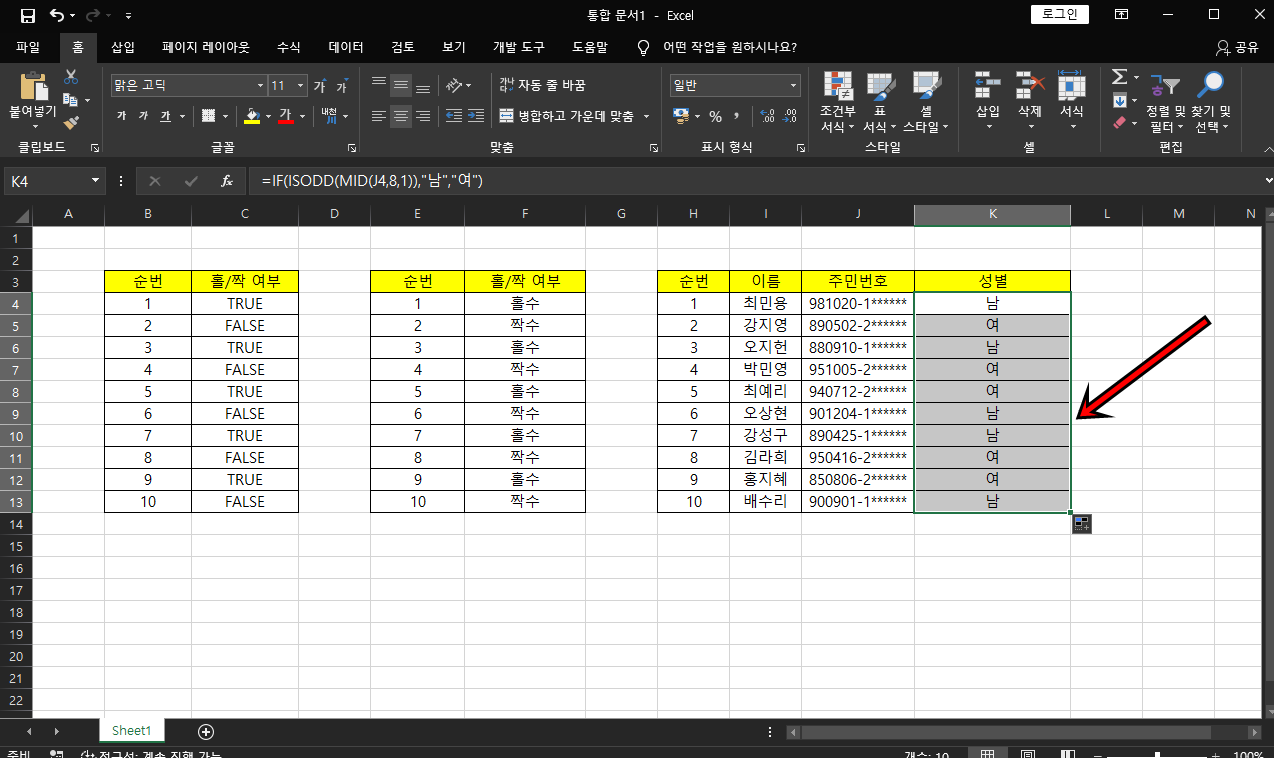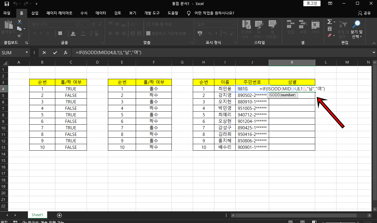 =IF(ISODD(MID(J4,8,1)), "남", "여") => MID함수를 통해 주민번호 8자리 번호가 1일 경우에 ISODD함수를 사용하여 TURE이면 남, FALSE이면 여로 출력한다는 뜻이에요.