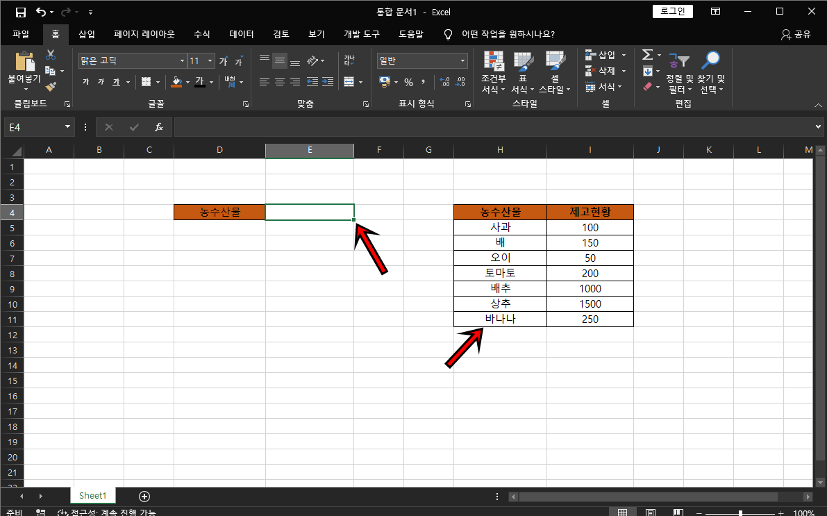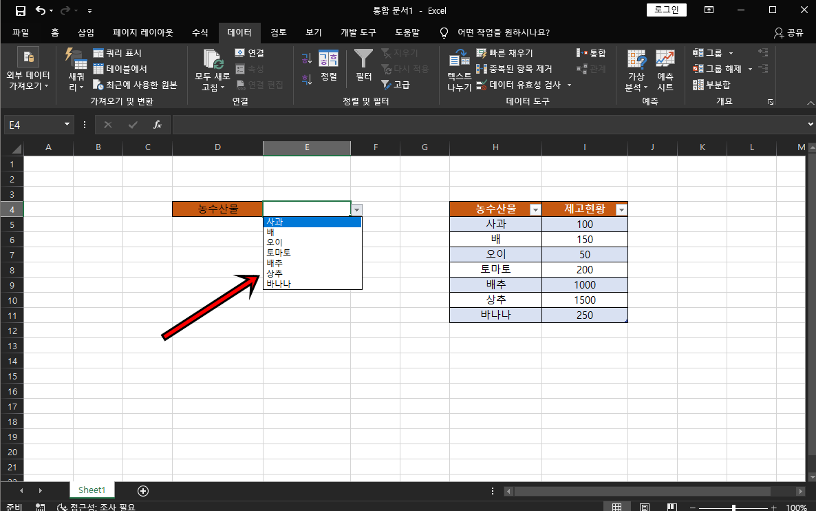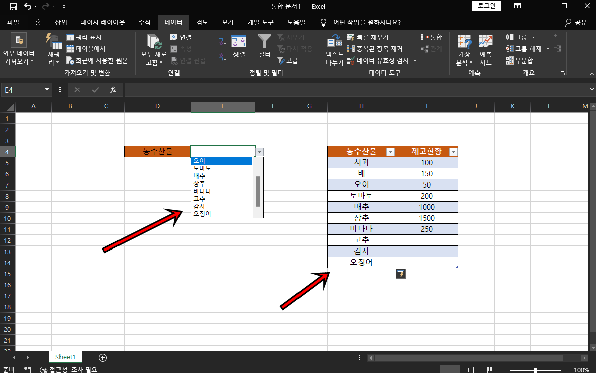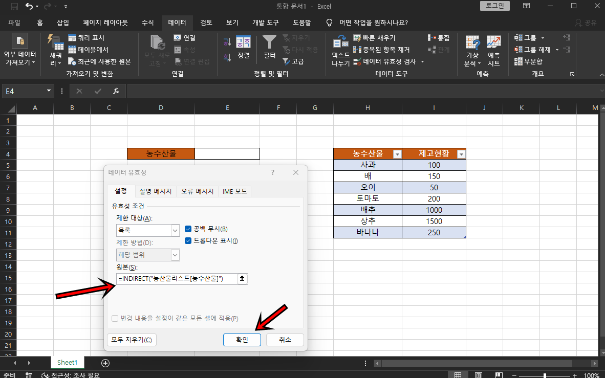 원본메뉴에는 INDIRECT함수를 사용하여 =INDIRECT("표이름[머리글]") 위 예제에서는 =INDIRECT("농산물리스트[농수산물]") 이 돼요. 함수를 입력하셨다면 확인 버튼을 클릭해 주세요.