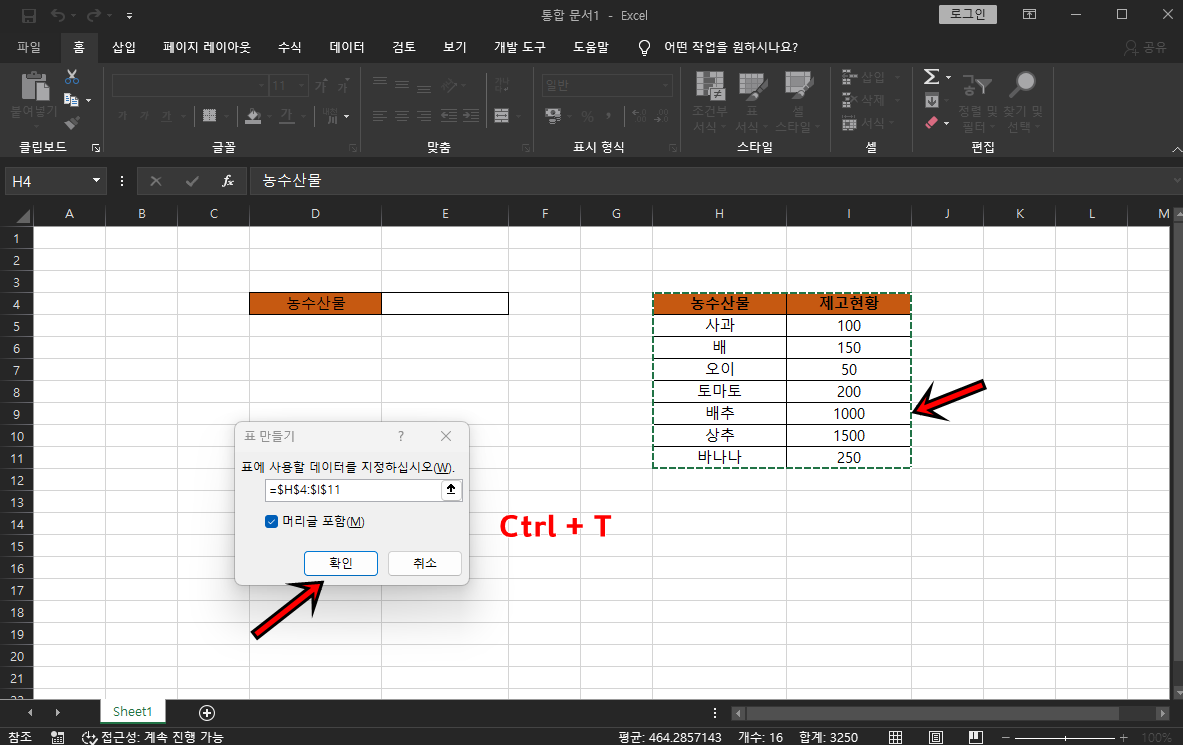 자 먼저 목록으로 만들 셀을 범위 지정후 Ctrl + T 단축키를 클릭 후 [확인] 버튼을 클릭하여 범위를 표로 변환해 주세요.