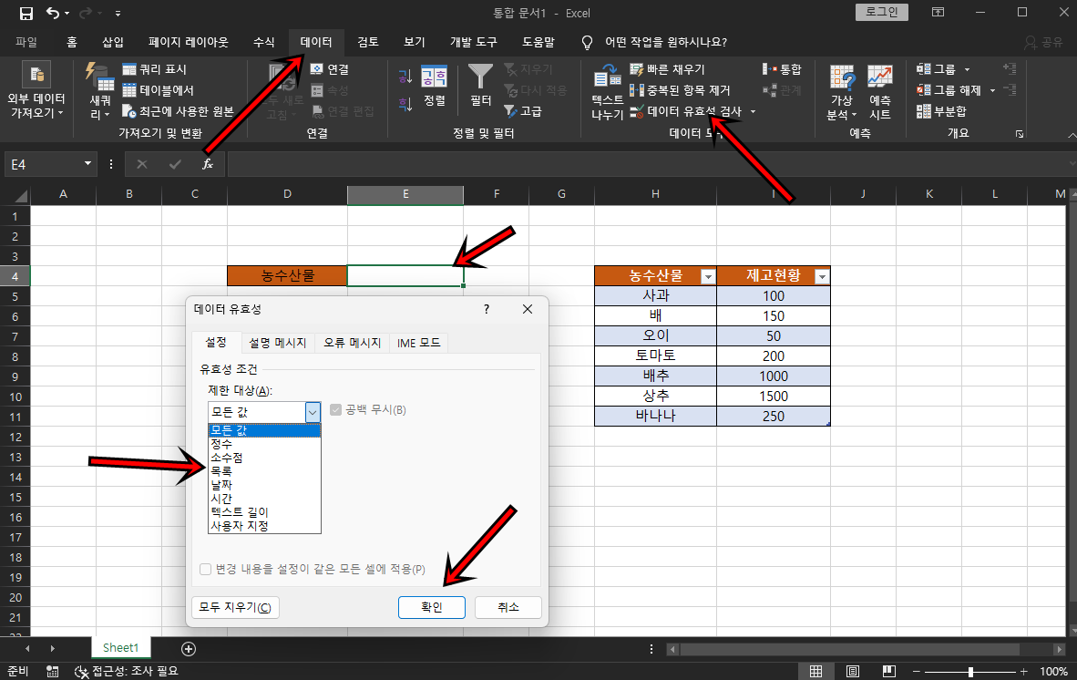 이제 목록을 적용할 셀을 선택 후 상단의 [데이터] 탭 -> [데이터 유효성 검사] -> 제한대상을 [목록]으로 선택해 주세요.