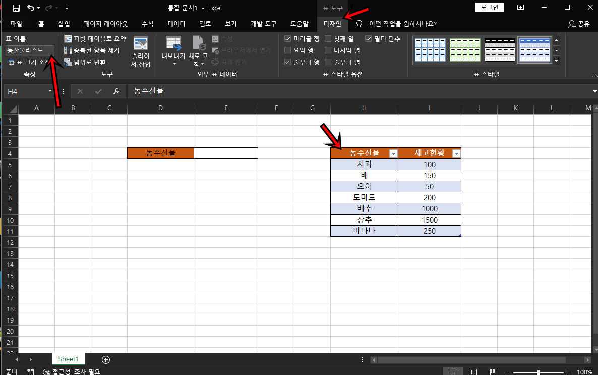 이제 표를 선택한 다음에 상단의 [디자인] 탭에서 표의 이름을 원하는 이름값으로 변경해 주세요 저의 경우는 "농산물리스트"에요.