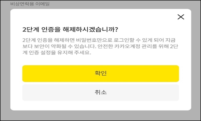 2단계 인증을 해제하시겠습니까?라는 창이 뜰 텐데 "확인"버튼을 클릭해 주세요.