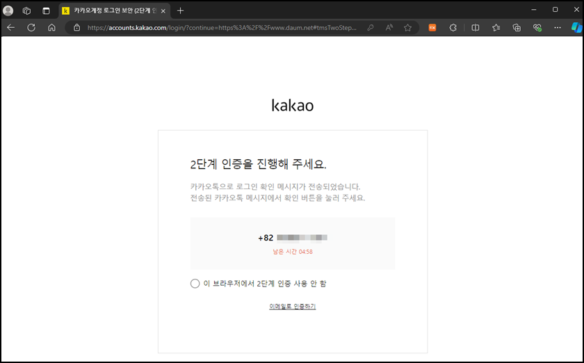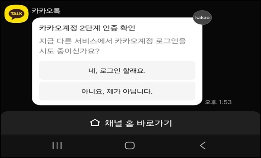 위 사진과 같이 카카오서비스에 접속을 하려고 하면 2단계 인증을 진행한다며, 카카오톡으로 로그인 확인 메시지가 전송되며 해당 카카오 메시지에서 확인버튼을 클릭해야 로그인이 가능한 보안 절차예요.
