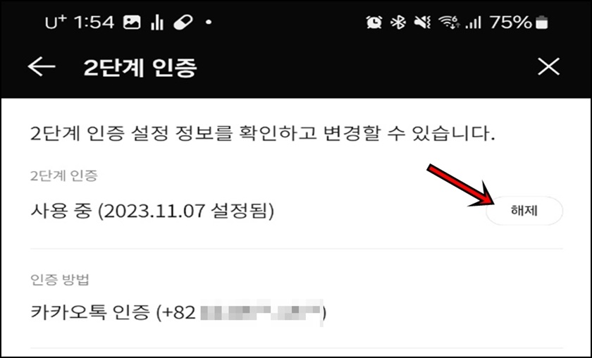 2단계 인증 사용중부분에 "해제"버튼을 클릭해 주세요.
