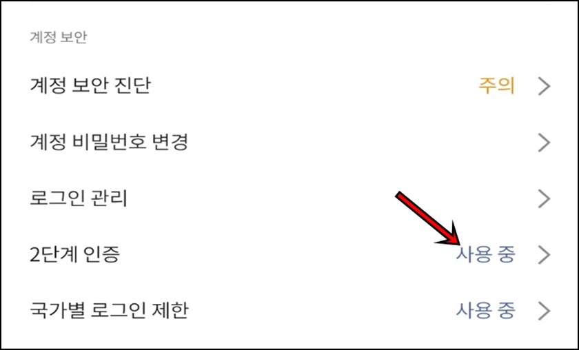 페이지 중간쯤에 계정보안의 "2단계 인증"이 사용 중이라고 나올 텐데 해당 부분을 클릭해 주세요.
