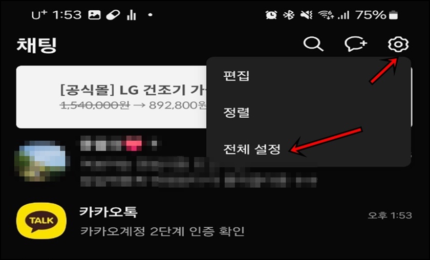 먼저 여러분의 카카오톡을 실행 후 오른쪽 상단의 톱니바퀴[설정]를 클릭 후 "전체 설정"메뉴를 클릭해 주세요.