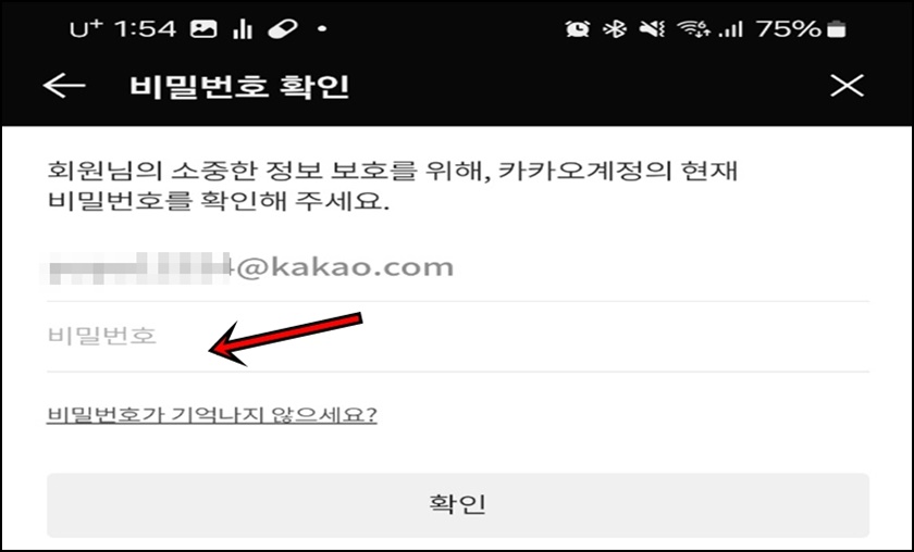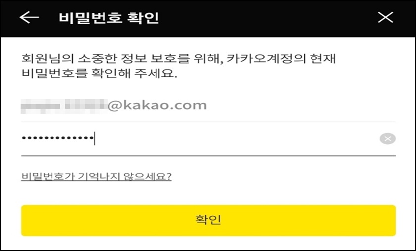 다시 한번 카카오 계정의 비밀번호를 입력 후 "확인"버튼을 클릭해 주세요.