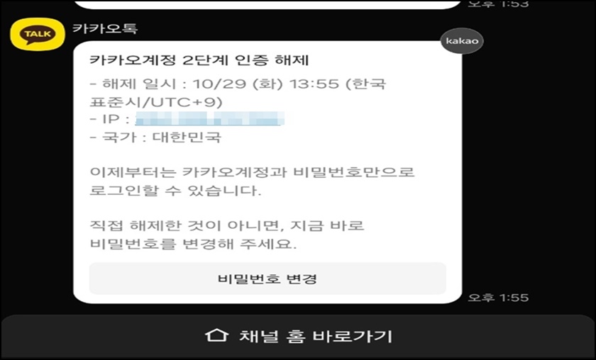 여러분의 카톡 메시지로 "카카오계정 2단계 인증 해제"메시지가 도착할 거예요. 이제부터 카카오계정과 비밀번호만으로 로그인할 수 있게 되었어요. 참 쉽죠?