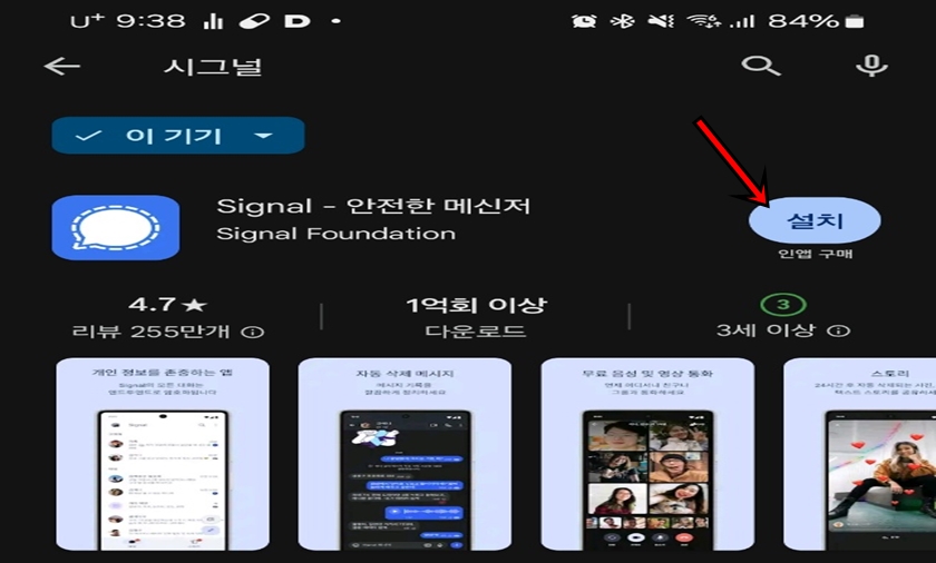 시그널 메신저 사용방법은 매우간단해요. 우선 여러분의 스마트폰에서 구글스토어 접속 후 "시그널"이라고 검색하시면 위 사진처럼 바로 "Signal - 안전한 메신저"어플을 확인할 수 있어요. 설치버튼을 클릭 후 실행해 주세요.
