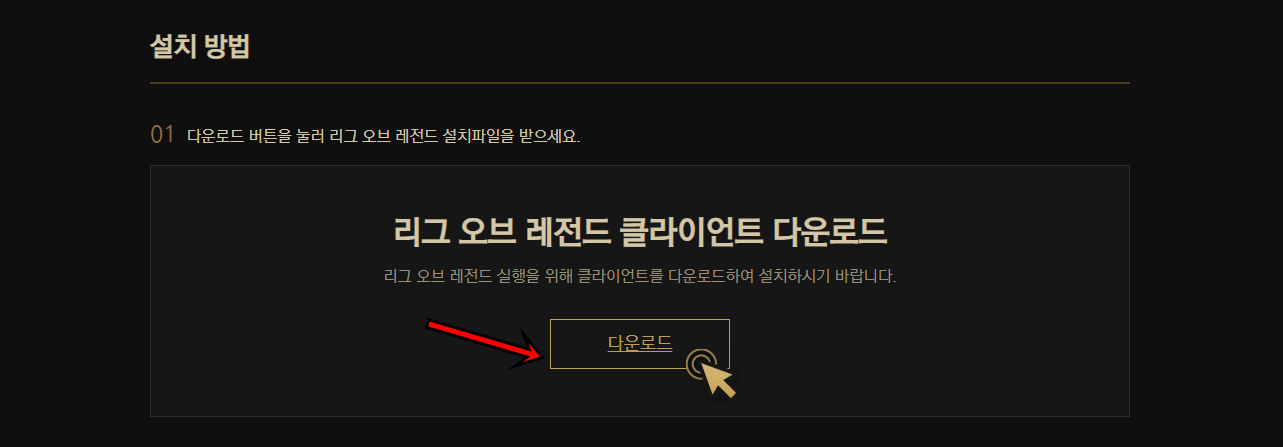 권장사양아래 보시면 설치방법에 "리그 오브 레전드 클라이언트 다운로드"가 보이실 텐데 다운로드를 해주세요.