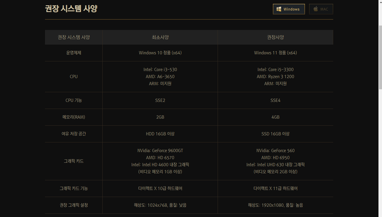 페이지 내려보시면 리그오브레전드가 동작할 PC의 사양을 확인할 수 있는데 게임이 돌아가는데 문제가 없을지 한번 사양을 체크해 보세요.