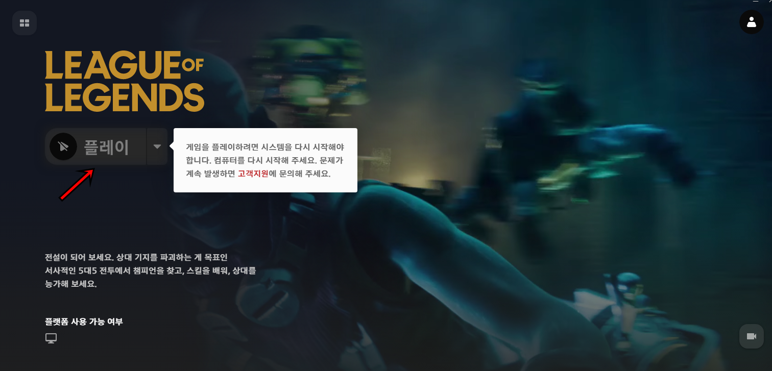 재부팅 후 다시 윈도에 설치된 리그오브레전드를 더블클릭하여 로그인하시면 "플레이"버튼을 통해 리그오브레전트 플레이가 가능해요. 참 쉽죠?^^