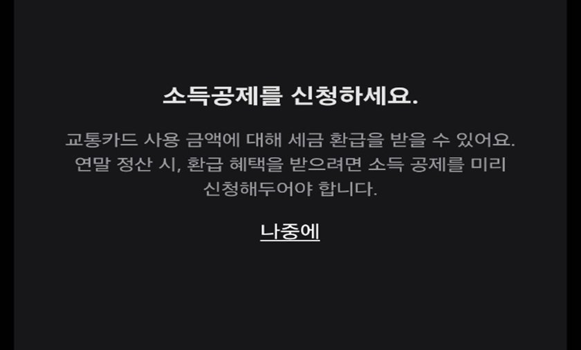 교통카드 사용 금액에 대해 세금 환급을 받을 수 있기에 연말정산 시 환급 혜택을 받으시려면 소득공제도 신청을 해두시면 좋아요.
