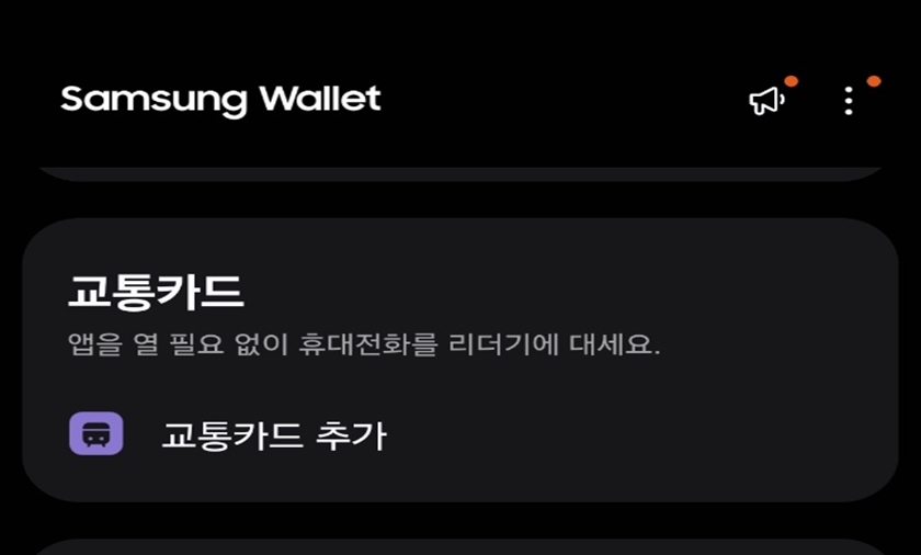 먼저 삼성페이앱을 실행 후 하단의 교통카드 "교통카드 추가"를 클릭해 주세요.
