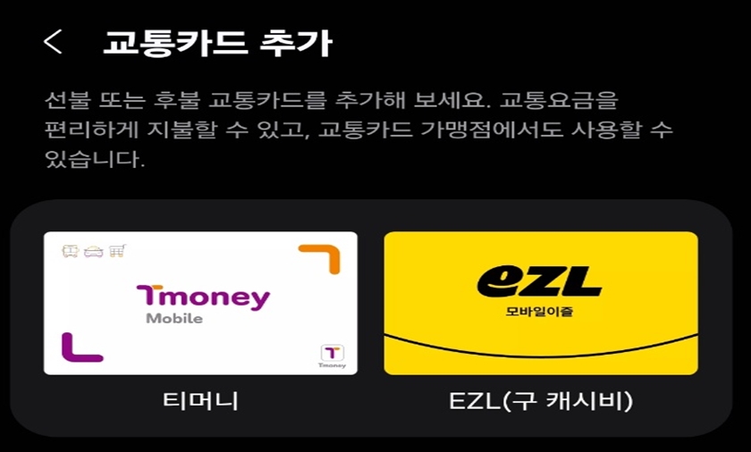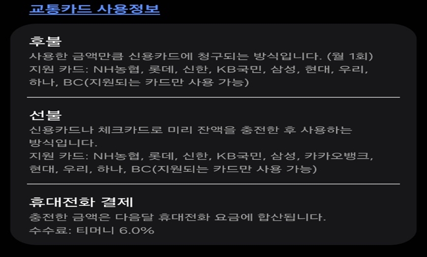 교통카드를 후불 혹은 선불, 휴대전화로 결제할지 택을 해주세요.