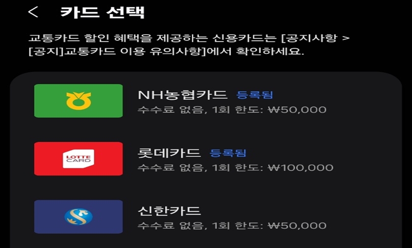 여러분이 소유하고 있는 카드 중 사용할 카드를 선택해 주세요. 단, 교통카드 기능을 추가해서 발급받은 신용카드를 선택해야 해요. 보통 카드 뒷면이나 앞면에 보시면 "후불(교통) 카드"라고 적혀 있는데 확인을 해주세요.