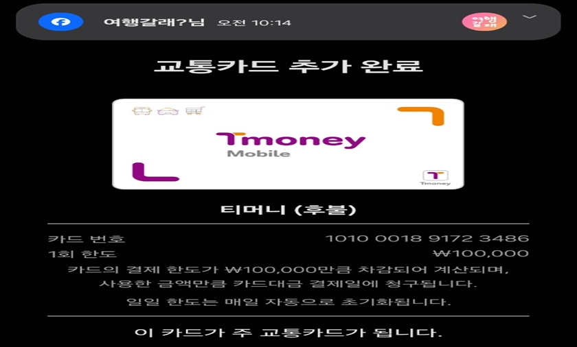 지문인식을 마치면 "티머니 교통카드"추가가 완료가 돼요.