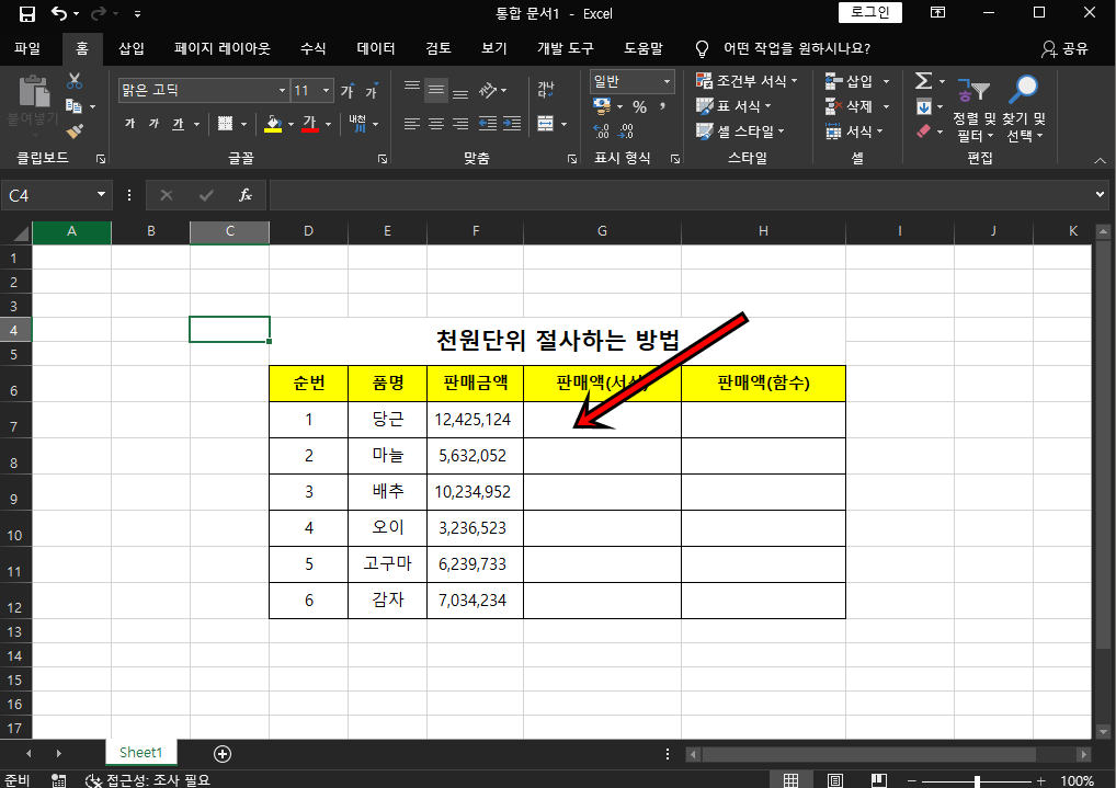 먼저 위와 같은 판매금액 엑셀이 있다고 가정해볼게요. 판매금액의 천 원 단위를 절사 하여 구해보도록 할게요.