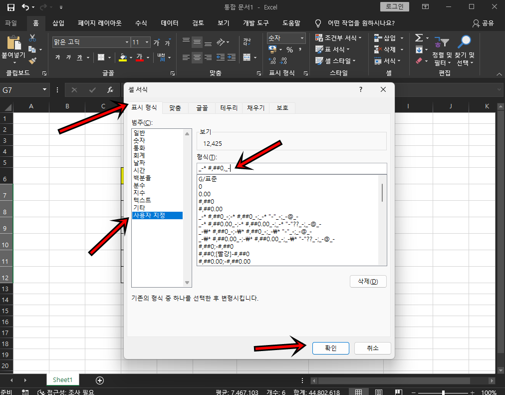 표시형식 -> 사용자 지정 -> 형식 부분에 _-* #,##0,_- 입력 후 "확인"버튼을 클릭해 주세요.