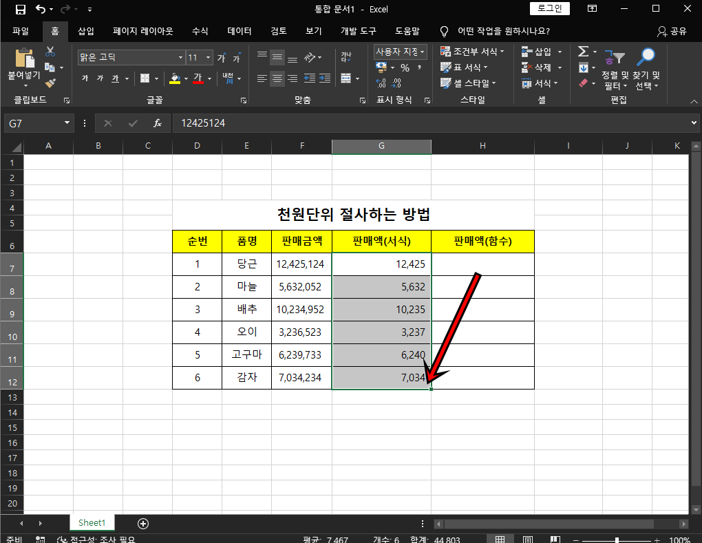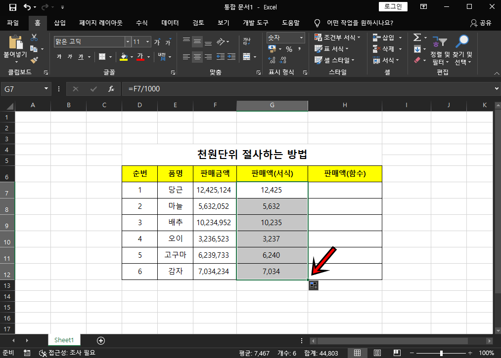 채우기 핸들을 통해 셀 서식으로 천 원 단위 절사하도록 해보았어요. 아주 간단하죠?