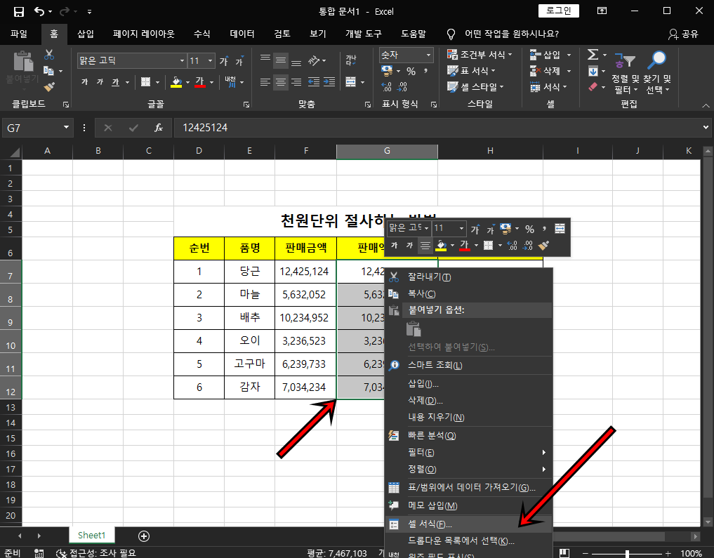 다음은 셀 서식을 통해 천 원 단위를 절사해보도록 할게요. 천원단위 절사할 셀을 드래그 후 마우스 우클릭 "셀 서식"을 클릭해 주세요.