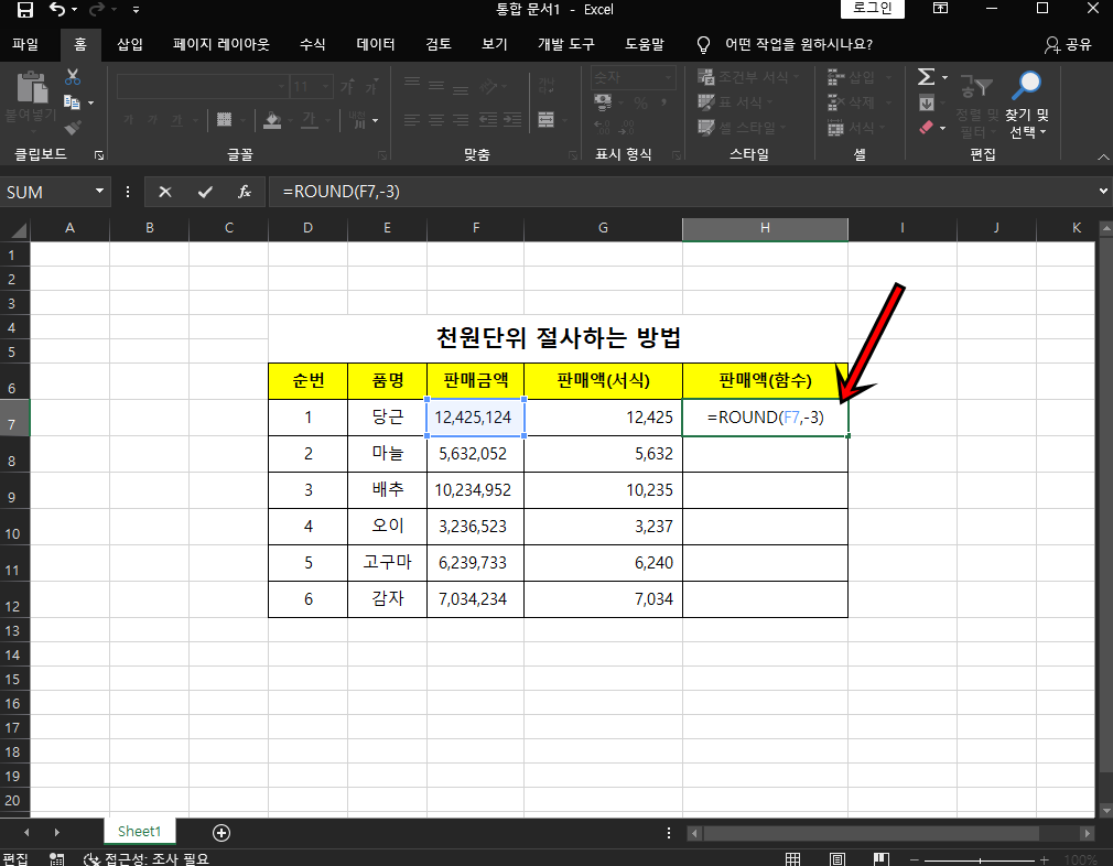 다음은 round함수를 이용하여 천원단위 숫자는 모드 0으로 표시해 보도록 할게요. =ROUND(셀,-3) 천 단위 절사를 하기 위해 자릿수를 -3으로 지정해 주는 거예요.