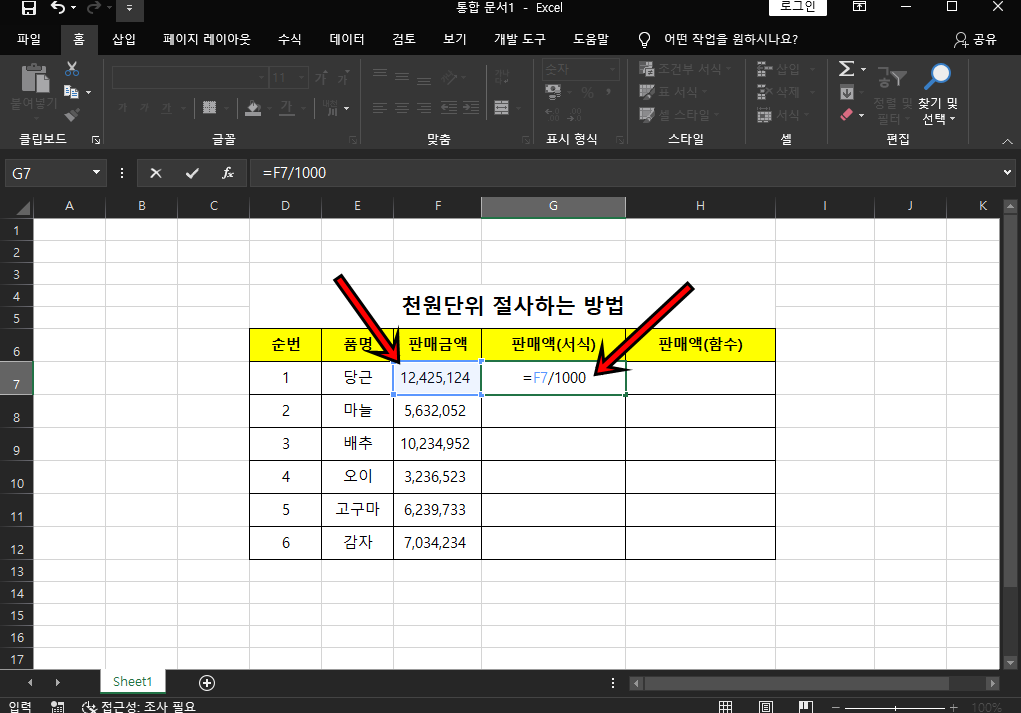 가장 간단한방법은 판매금액에서 나누기 /1000을 해주면 되는데요. 위 사진처럼 =판매금액셀/1000을 해주시면 돼요.