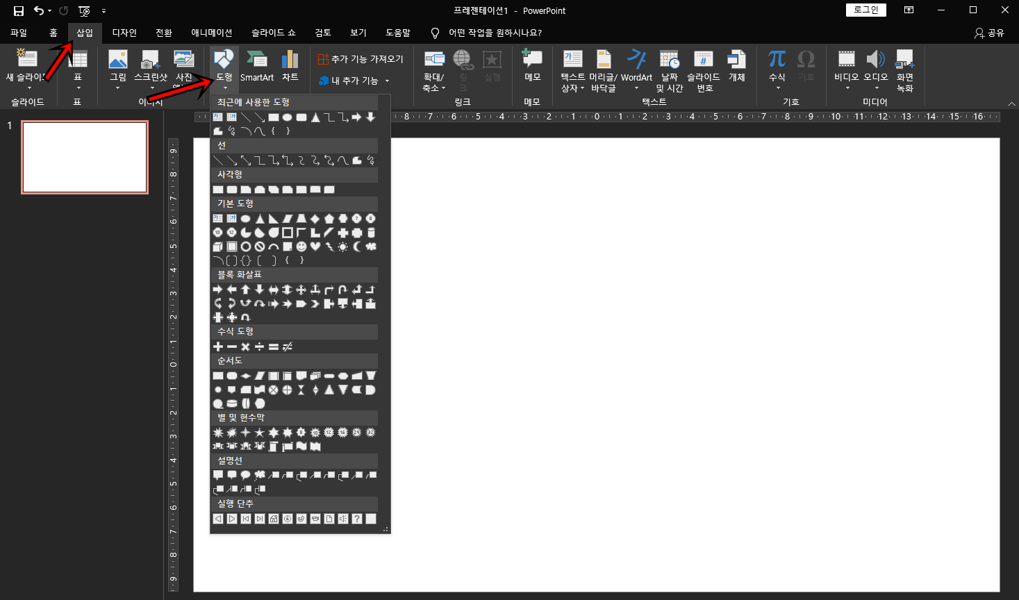 첫 번째는 일반적으로 가장 많이 사용하는 한 개의 도형에 이미지를 넣는 방법이에요. 우선 상단의 [삽입] 탭을 클릭하여 도형을 클릭 후 원하시는 도형을 선택해서 만들어주세요.