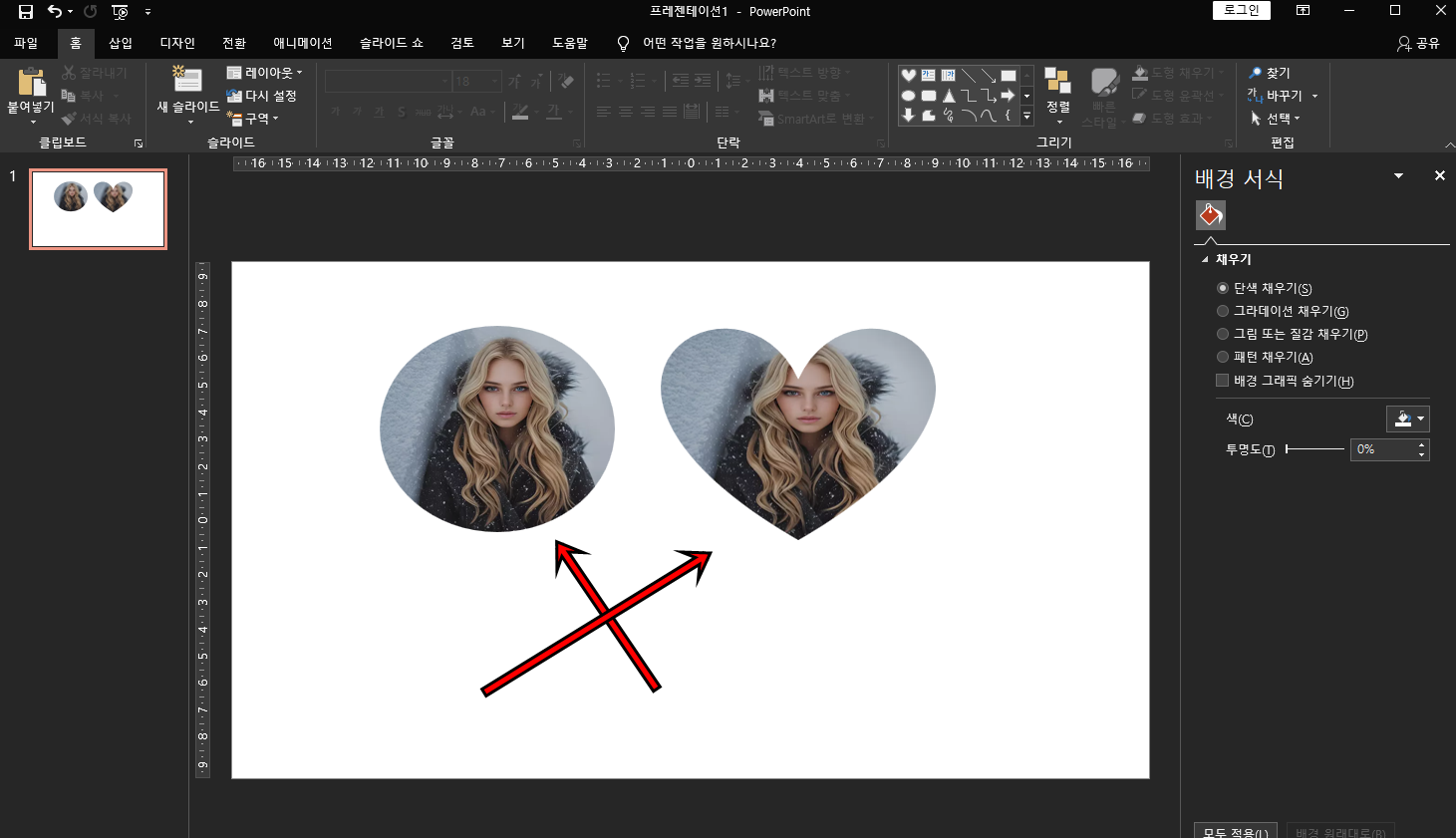 아주 간단하게 원형 모양과 하트 모양 도형에 그림이 삽입되었어요. 아주 간단하죠?