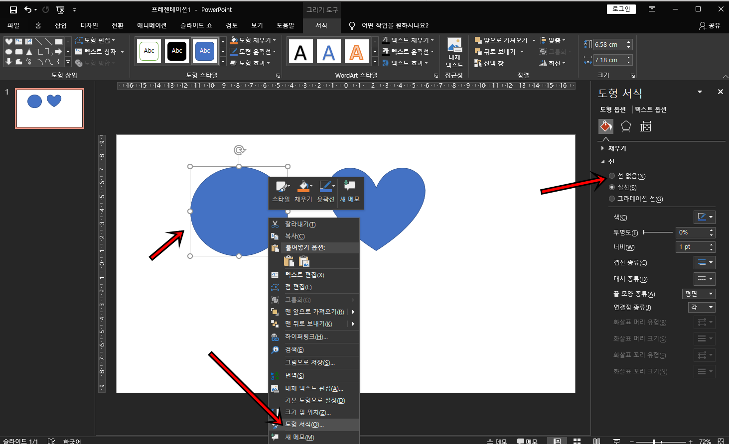 도형을 만드셨다면 도형을 클릭후 마우스 우클릭 -> 도형 서식을 클릭한 다음 오른쪽 선 메뉴에서 "선 없음"으로 선택을 해주세요. 선 없음으로 하는 게 이미지가 깔끔하게 보이는 것 같더라고요.