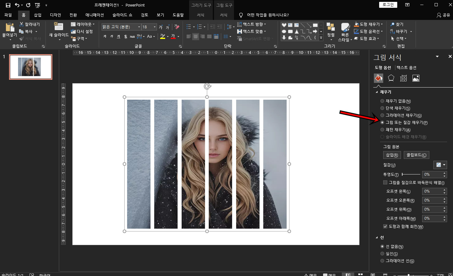 그다음은 그림 서식을 클릭하여 채우기 메뉴에서 "그림 또는 질감 채우기"를 클릭해 주세요.