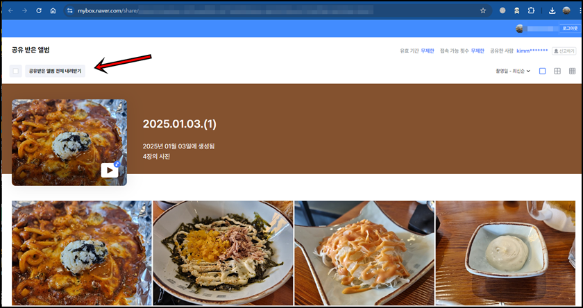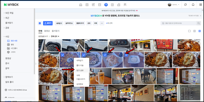 우선 여러분의 PC에서 네이버 MYBOX웹페이지로 이동을 해주세요. 공유하고 싶거나 전달하고 싶은 사진을 하나 혹은 여러 장을 클릭 후 마우스 우클릭, 그다음은 "링크 공유"버튼을 클릭해 주세요.