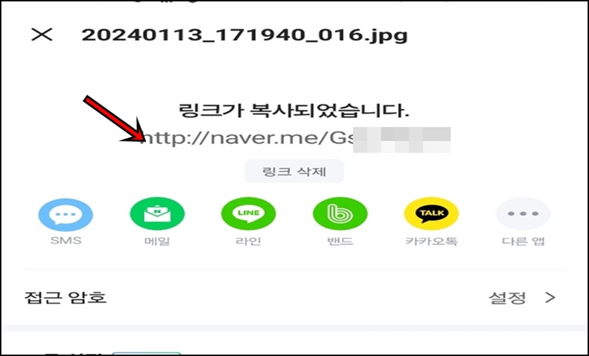 PC와 같이 공유를 하고 싶다면 동일하게 링크 공유 버튼을 클릭하면 PC환경처럼 링크가 생성되는데 해당 링크를 복사해서 카톡이나 문자메시지로 전송을 하시면 돼요.