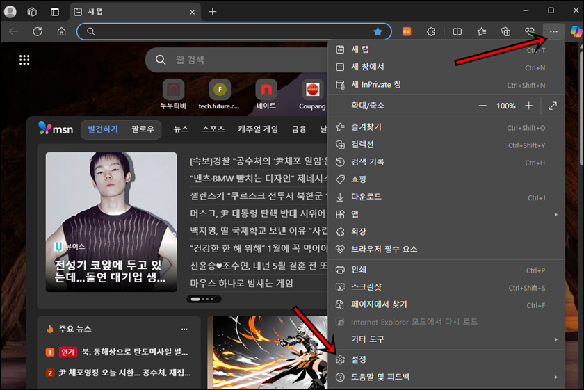먼저 엣지브라우저를 실행 후 오른쪽 상단의 메뉴를 클릭 후 [설정] 메뉴로 들어가 주세요.